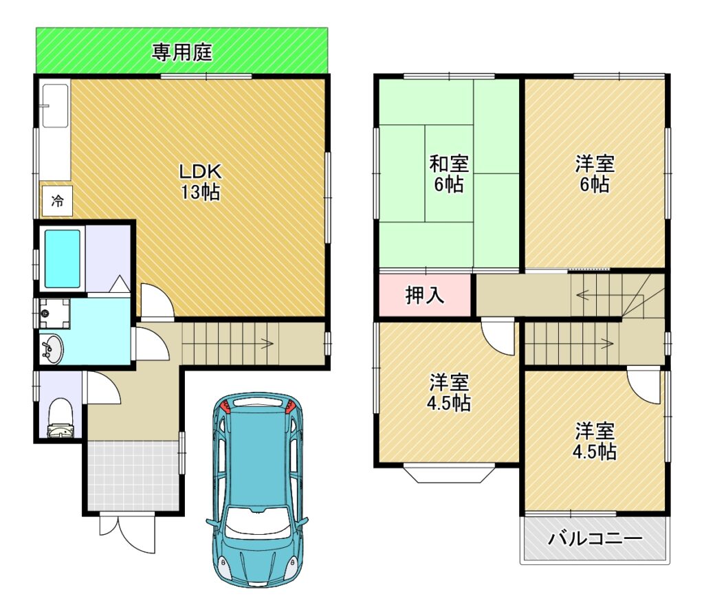 LDK 13畳 1階 洋室 6畳 洋室 4.5畳 和室 6畳 洋室 4.5畳 |