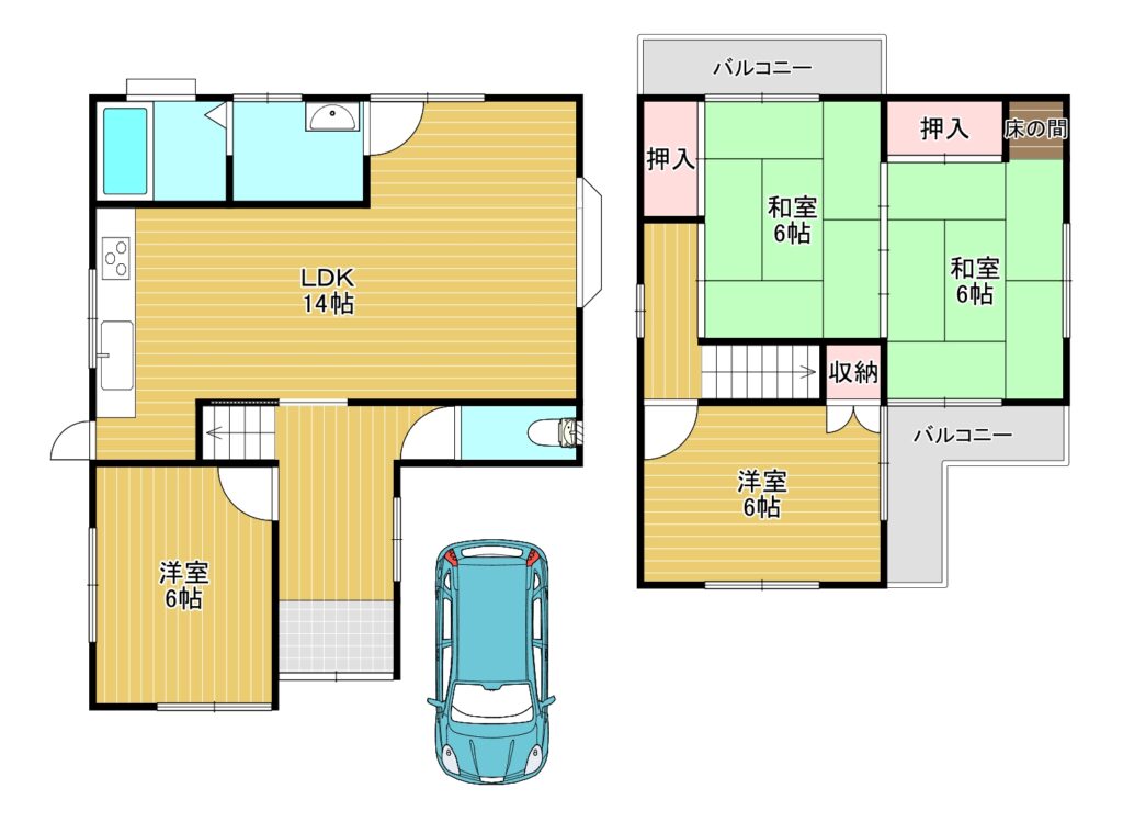 間取内容 LDK 14畳 1階  洋室 6畳 1階  和室 6畳 2階  和室 6畳 2階  洋室 6畳 2階
